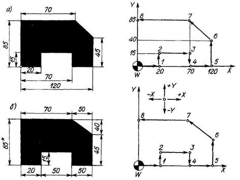 При установке детали на станок (рис. 14. б) положение нуля детали (точки W ) будет зафиксировано относительно координатной системы станка XYZ координатами xMW, yMW, zMW. Если при обработке детали используют приспособление (рис. 14.5, в), то оно должно быть закоординировано на станке относительно нуля станка (точки М). Система ZиNXи определяет координатную систему инструмента (см. рис 14.5, б ). Естественно, что при установке детали в приспособлении координатная Рис. 14,6. Схемы задании система детали XДWYД, должна совпадать с координат опорных точек 1-3 координатной системой приспособления XпGYn. а - абсолютные размеры; При обработке детали при движении по элементам б - размеры в приращениях траекторий (прямым, дугам, кривым) в промежутках между опорными точками инструмент в определенных случаях может перемещаться по траектории, несколько отличающейся от заданной. Однако можно задать такое опорных точек, при котором отклонения от фактической граектории от требуеиой будет меньше некоторой наперед заданной величины и деталь будет об р а- ботана в пределах заданной точности. Таким образом, начальный этап представления траектории обработки детали связан прежде всего с получением координат_опор ны х точек траектории. Эти координаты могут быть выражены абсолютными размерами, т. е. для каждой опорной точки заданными относительно нулевой точки станка или детали (рис 14.6, а), или задаваться в виде приращений в направлении движения инструмента от одной опорной точки к
