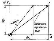 другой (рис. 14.6, б). При записи УП способ задания кодируется буквенно-цифровыми символами G90 (абсолютные координаты) и G91 (размеры в приращениях). Так, при перемещении центра инструмента (рис. 14.6,б) из точки W в точку 1 координата х изменится на величину ∆ x1, а координата у - на величину ∆ y 1; при дальнейшем движении из точки 1 в точку 2 приращение по оси X составит ∆х2, по оси Y - ∆y2 т. д. Задание координатами точек траектории движения центра инструмента зависит во многом от способа_ задания р азмеров детали (рис. 14.7). В большинстве систем ЧПУ работой станка управляют дискретно, с помощью импульсов. Цена одного импульса (наименьшее программируемое перемещение), или дискретность системы, отражает разрешающую_способность комплекса, включающего систему ЧПУ, механизм подач и датчики обратной связи. Исходя из дискретности системы приращения координат между опорными точками траектории можно выразить не в мм, а количеством импульсов. Например, если дискретность по оси X составляет 0,01 мм/имп., а по оси Y - 0,02 мм/имп., то значения ∆х и ∆у, равные, например, соответственно 12,85 мм и 8,6 мм, в импульсах будут выражены следующим образом: ∆х =1285 имп., ∆у = 430 имп. Задание приращений по двум осям координат, однако, еще не определит заданного прямолинейного движения инструмента между точками. Даже при постоянной скорости подачи по осям вследствие неравенства координат заданной точки (∆ x 1≠∆ y 1) время движения по оси X не будет равно времени движения по оси У и заданная траектория будет искаженной (на рис. 14.8, а показано штрихами). Как уже говорилось, приблизить фактическую траекторию к заданной можно введением дополнительных (промежуточных) опорных точек (точки 2 - 5 на рис. 14.8,б) и заданием соответствующей последовательности перемещений инструменту между этими точками, например: (∆ х, ∆ y); (2∆ х); (2∆ х, 2∆ у); (∆ х); (∆ х, ∆. у ), т. е. траекторию по сравнению с ранее определенной (см. рис. 14.8, а) приходится разбивать на более мелкие участки. Величина δ определит ошибку в отработке. При программировании введение дополнительных опорных точек приводит к резкому увеличению расчетов и объема программы. Поэтому в практике_детальное представление заданной траектории движения инструмента между двумя опорными точками (с выдачей команд на соответствующие перемещения по осям) осуществляется с помощью спе-циального вычислительного устройства - элемента УЧПУ - интерполятора. Интерполятор непрерывно, т. е. в каждый данный момент, в процессе перемещения (в соответствии с