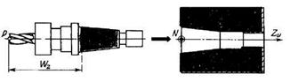 в ту же сторону. Начало системы Рис. 14.25. Схема базирования инструмента координат инструмента располагают в базовой точке Т инструментального блока, выбираемой с учетом особенностей его установки на станке При установке блока на станке точка Т часто совмещается с базовой точкой элемента станка, несущего инструмент, например с точкой N (рис. 14.25). Режущая часть инструмента характеризуется положением его вершины и режущих кромок. Вершина инструмента задается радиусом закругления r и координатами хиТР и zиTP ее настроечной точки Р (см. рис 14.24, а), положение которой относительно начала системы координат инструмента обеспечивается наладкой инструментального блока вне станка на специальном приспособлении. Положение режущей кромки резца задается главным φ и вспомогательным φ1 углами в плане, а сверла - углом 2φ при вершине и диаметром D. Вершина вращающегося инструмента лежит на оси вращения, и поэтому для ее задания достаточно указать аппликату zиТР. Настроечная точка инструмента Р обычно используется в качестве расчетной при вычислении траектории инструмента, элементы которой параллельны координатным осям Расчетной точкой криволинейной траектории служит центр закругления Р и при вершине инструмента (см. рис. 14.24, а). Связь систем координат. Таким образом, при обработке детали на станке с ЧПУ (рис 14.26, а) можно выделить три координатные системы. Первая - система координат станка XMZ, имеющая начало отсчета в точке М - нуль станка, (рис. 14.26, б). В этой системе определяются положения базовых точек отдельных узлов станка, причем числовые значения координат тех или иных точек (например, точки F) выводятся на табло цифровой индикации станка. Вторая координатная система - это система координат детали или программы обработки детали XДWZД (рис 14.26, в). И третья система - система координат инструмента XиTZи (рис. 14.26, г), в которой определено положение центра Р инструмента относительно базовой точки F (К, Т) элемента станка, несущего инструмент.