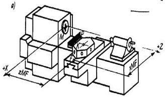 Рис. 14.27. Связь систем координат при обработке на токарном станке Положения базовых точек инструментальных блоков, устанавливаемых на одном разцедержателе, определяют относительно его центра К приращениями коорлинах ZиKТ и ХиКТ. На одном суппорте может быть несколько резцедержателей, и в зависимости от характера работ (в патроне или в центрах) разцедержатель может занимать на суппорте токарного станка различные положения. В связи с этим центр резцедержателя должен быть определен приращениями координат zиFK и xиFK относительно базовой точки суппорта F. В частном случае, когда на суппорте находится один непереставляемый резцедержатель, базовая точка суппорта может быть совмещена с центром поворота резцедержателя или с базовой точкой инструментального блока. При закреплении заготовки на станке (рис. 14.27, а) технологическая база для обработки детали в данном установе совмещается с соответствующей опорной поверхностью приспособления (совмещаются точки С и В '). Это позволяет увязать между собой системы координат программы и станка. Так как оси вращения шпинделя токарного станка и обрабатываемой детали совпадают, достаточно для увязки этих систем координат определить аппликату точки W начала системы координат программы в системе координат станка. Для случая, когда оси аппликат систем координат программы и станка направлены в одну сторону, zMW = zMC — zДWB, где zMC и zWB ' - аппликаты базовых точек в системах координат станка и программы с соответствующими знаками. В данном случае (см. рис. 14.27, а) zMW = zMC – (– zдWB r) = zMC + zдWB '. Если же оси аппликат этих систем направлены в противоположные стороны (рис. 14.27, б), то zMW = zMC + z д WB ", где z д WB " — аппликата положения базовой точки В " детали при обработке ее на втором установе. Естественно, в данном случае принято, что положение базовой точки С приспособления относительно точки М остается постоянным, т. е. равным zМС, как и при