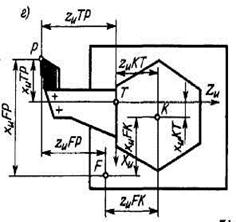 При определении координат хМР и zMP необходимо учитывать направления составляющих величин. Если базовая точка суппорта F совмещена с базовой точкой инструментального блока Т, то текущие значения координат центра инструмента определятся лишь с учетом вылета инструмента, т. е. его координат в системе координат инструмента:
