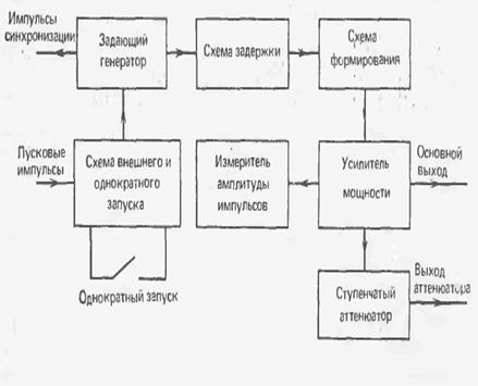 Генераторы с одинаковой точностью установки амплитуды, длительности, частоты следования и временного сдвига импульсов. Структурная схема простейшего генератора импульсов одноканального типа изображена на рис. 4. Задающий генератор вырабатывает импульсы с частотой следования, регулируемой плавно, либо дискретно в заданном диапазоне. Импульсы задающего генератора используются для запуска схемы задержки и схемы формирования импульсов. Одновременно задающий генератор выдает импульсы синхронизации с той же частотой следования, выведенные на отдельное гнездо. Таким образом, с помощью элемента задержки можно обеспечить временной сдвиг основного сигнала относительно импульсов синхронизации. Задающий генератор может работать как в автоколебательном, так и в ждущем режиме. В ждущем режиме для запуска генератора необходимы пусковые импульсы, которые формируются устройством внешнего и однократного запуска. В ряде генераторов имеются возможности запуска генератора от последовательности внешних пусковых импульсов и однократного запуска путем подачи пускового импульса, сформированного в специальном устройстве. В режиме однократного запуска пусковой импульс в данной схеме формируется при нажатии кнопки, расположенной на передней панели прибора. Устройство задержки выдает импульсы, задержанные относительно запускающих импульсов, поступающих от задающего генератора. Время задержки регулируется либо плавно, либо дискретно. Схема формирования основных импульсов вырабатывает прямоугольные импульсы требуемой длительности и формы. Схема формирования позволяет устанавливать нужную длительность основных импульсов либо плавно, либо дискретно. В некоторых приборах регулируются длительность фронта и среза. Усилитель мощности предназначен для увеличения амплитуды основных импульсов до необходимого значения, изменения их полярности, а также для согласования схемы формирования основных импульсов с нагрузкой. Усилитель позволяет плавно изменять амплитуду импульсов в несколько раз. Для получения импульсов малой амплитуды служит ступенчатый аттенюатор, ослабляющий сигнал на 40.....100 дБ. Измеритель амплитуды импульсов предназначен для измерения установленного значения амплитуды выходного сигнала и представляет собой импульсный вольтметр.
