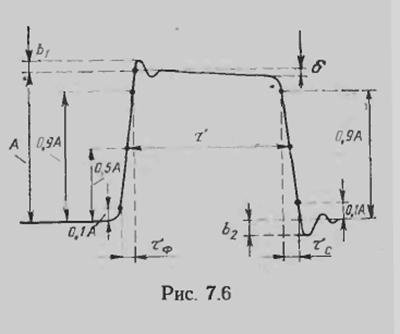 Реальная форма импульсов на выходе импульсного генератора отличается от прямоугольной. Характерные искажения формы импульсов показаны на рис. 5. Амплитуду импульса определяют продлением плоской части вершины до пересечения с фронтом. Амплитуда импульсов на выходе генератора зависит от сопротивления подключенной к нему нагрузки. Поэтому значение амплитуды импульсов, обеспечиваемой генератором, указывается для определенного сопротивления нагрузки. Длительность импульса прямоугольной формы τ определяется на уровне 0,5 от значения амплитуды. Длительность фронта τф – время, в течение которого напряжение импульса нарастает от значения 0,1 до 0,9 амплитуды. Длительность среза τс – время, в течение которого напряжение импульса уменьшается от 0,9 до 0,1 от значения амплитуды. Неравномерность вершины импульса δ1 — изменение плоской части вершины импульса. Оценивается в процентах по отношению к значению амплитуды. Выбросы на вершине b1 и срезе b 2 импульса – кратковременное отклонение мгновенного значения импульсного напряжения при установлении вершины или на участке среза от линий, определяющих его вершину и основание. Выбросы импульса оцениваются в процентах от значения амплитуды. По длительности генерируемых импульсов генераторы прямоугольных импульсов делятся на генераторы микросекундного и наносекундного диапазонов длительностей. Первые выдают импульсы длительностью 10-1...106 мкс, вторые 1...25000 нc. Помимо импульсных генераторов, предназначенных для формирования импульсов прямоугольной формы, существуют генераторы сигналов специальной формы, относящиеся к группе Г6. Генераторы этого типа вырабатывают набор сигналов специальной формы, в том числе пилообразной, треугольной, ступенчатой и т. п. Часто эти же генераторы вырабатывают многофазный синусоидальный сигнал. Например, генератор Г6-26 выдает набор синусоидальных сигналов с фазами 0°, 90°, 180°, 270°. В телевизионном генераторе Г6-8 вырабатываются импульсы синусквадратичной формы, с помощью которых оценивается полоса пропускания видеотракта, сигнал ступенчатой формы для оценки нелинейных искажений и др.
