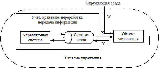 Управляющая система совместно с системой связи образует систему управления. Система связи включает канал прямой связи, по которому передается входная информация {x} и канал обратной связи, по которому к управляющей системе передается информация о состоянии объекта управления {y}. Информация об управляемом объекте и внешней среде воспринимается управляющей системой, перерабатывается в соответствие с той или иной целью управления и в виде управляющих воздействий {u} передается на объект управления. Использование понятия обратной связи является отличительной чертой кибернетического подхода.