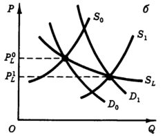 Если после достижения равновесия отраслевой спрос возрастет (сдвиг D 0 (r) D 1), то вначале (в коротком периоде) цена поднимется с PL до P 1. При такой цене фирмы станут получать свехприбыль, что приведет к увеличению предложения в отрасли как за счет расширения производства в отдельных фирмах, так и вследствие прихода новых фирм (на рис. 11.7 это отразится сдвигом S 0 (r) S 1). В результате цена снова снизится до PL, так как именно этой величине равен минимум LAC, фирм при данной технологии. Если же спрос сократится (D 0 (r) D 1), то фирмы будут вынуждены снизить объемы производства, а часть из них уйдет из отрасли. Отраслевое равновесие переместится из точки E 0 в точку Е 3. При цене P 2 фирмы окажутся в положении, представленном на рис. 11.4- г, или даже в "запредельном" положении. Некоторые фирмы станут закрываться и переходить в другие отрасли. Рыночное предложение сократится (сдвиг), и цена возрастет с Р 2 до РL. Если соединить все возможные точки равновесия отрасли в длительном периоде при различных сочетаниях совокупного спроса и совокупного предложения (на рис. 6 это точки Е 4, Е 0, E 2), то образуется линия предложения отрасли в длительном периоде - SL. Поскольку мы предположили цены на факторы производства неизменными, линия SL проходит параллельно оси абсцисс. Это имеет место не всегда. Увеличивающийся по мере расширения производства благ отраслевой спрос на факторы может привести к их подорожанию. Тогда у фирмы возрастут затраты (сдвинется вверх семейство кривых рис. 11.6) и равновесие отрасли установится при более высокой цене (рис. 11.8 - а).