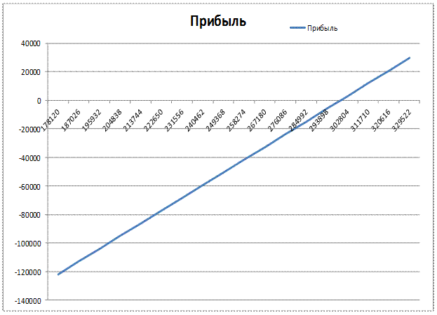 На основании информации таблицы, покажем графическое изображение прибыли в зависимости от суммы покрытия (разность дохода и переменных издержек). Точке безубыточности соответствует значение суммы покрытия, пересечение горизонтальной оси с графиком прибыли.