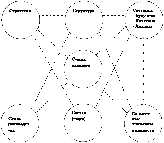 (Питерс Т, Уотерман Р. и др.) Эту схему предложили в фирме «Маккинси». Смысл: есть некоторый набор систем (7) в каждой организации, и, чтобы фирма работала успешно, нужно развивать их всех.