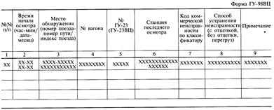 Рисунок - Книга регистрации коммерческих неисправностей в пунктах коммерческого осмотра вагонов В случае обнаружения вагонов (контейнеров) с коммерческими неисправностями, угрожающими сохранности грузов, доступ к грузу должен быть незамедлительно устранен и при необходимости наложены запорно-пломбировочные устройства или пломбы. Вагоны (контейнеры), обнаруженные с неисправностями, требующими перегруза, с наличием признаков хищения проломами, пробоинами стен, крыши, пола вагона и контейнеров, следами вскрытия тары и выемки грузовых мест), а также вагоны с разрядными грузами, огнестрельным оружием и грузами иностранных представительств в обязательном порядке проверяют на станции обнаружения неисправностей с выгрузкой груза и проверкой его количества и состояния. При невозможности проверки груза на данной станции из-за отсутствия необходимых обустройств допускается пропуск таких вагонов до ближайшей станции своей дороги, располагающей такими обустройствами. При этом пропуск производится после выполнения предварительной проверки груза без выгрузки из вагона. Порядок пропуска таких вагонов устанавливает начальник службы грузовой и коммерческой работы. Во всех случаях проверка наличия и состояния груза в вагоне (контейнере) должна быть проведена в двухсуточный срок после отцепки вагона для устранения коммерческих неисправностей или перегрузки в другой вагон (контейнер). Во всех случаях обнаружения вагонов с коммерческими неисправностями, угрожающими сохранности перевозимых грузов, в акте общей формы отражается факт обнаружения неисправности и результаты проверки груза, в том числе состояние запорно - пломбировочных устройств (пломб), закруток, плашек, запоров на дверях и люках, состояние кузова вагона и состояние погрузки с указанием полноты загрузки вагона, равномерности поверхности груза, числа ярусов в междверном пространстве и т.п. Если груз погружен навалом и подсчет рядов и ярусов невозможен, расположение груза в междверном пространстве описывается по равномерности погрузки, номерам грузовых мест, особым приметам упаковки. При перевозках автотракторной техники в акте общей формы отражаются повреждения техники, недостача деталей и узлов, а при нарушении отдельных мест с запасными частями и инструментом, если отсутствует опись - их фактическое наличие. При наличии признаков хищения они описываются подробно, с указанием точного местоположения, размеров выемок груза, номеров вскрытых грузовых мест и т.п. В акте общей формы указывается также способ устранения доступа к грузу и сведения об оттисках на запорно-пломбировочных устройствах (пломбах), наложенных на вагон (контейнер), автотракторную технику. Акт общей формы приобщается к перевозочным документам, а на станцию назначения направляется соответствующая телеграмма. Если вагон поступил на станцию с коммерческой неисправностью, уже оформленной актом общей формы, и состояние вагона (груза) по сравнению с описанием в акте не изменилось, попутный акт общей формы записывается в книгу формы ГУ-98 и повторно акт общей формы не составляется. К коммерческому акту, в случае его составления, приобщается копия акта общей формы. Запрещается ставить в поезда: - вагоны с неисправностями, угрожающими безопасности движения, и состояние которых не обеспечивает
