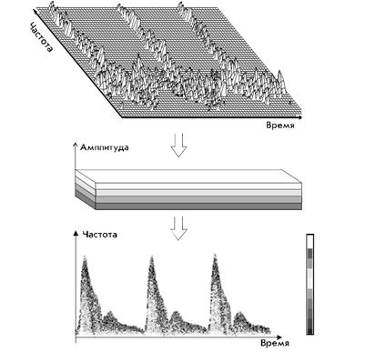 где с – скорость распространения УЗ в мягких тканях (с=1500 м/c). Выражая из данной формулы скорость и зная остальные значения, мы можем рассчитать скорость кровотока отдельных частиц крови, движение стенок сосудов и сердца. Экспериментально определено, что в норме разница между F0 и Fотр соответствует частотному диапазону 0 – 5 кГц. При нарушениях кровотока эта разница лежит в диапазоне 5 – 20 кГц. Технические аспекты реализации метода Обычно результат работы доплеровского прибора представляется в виде двух изображений.