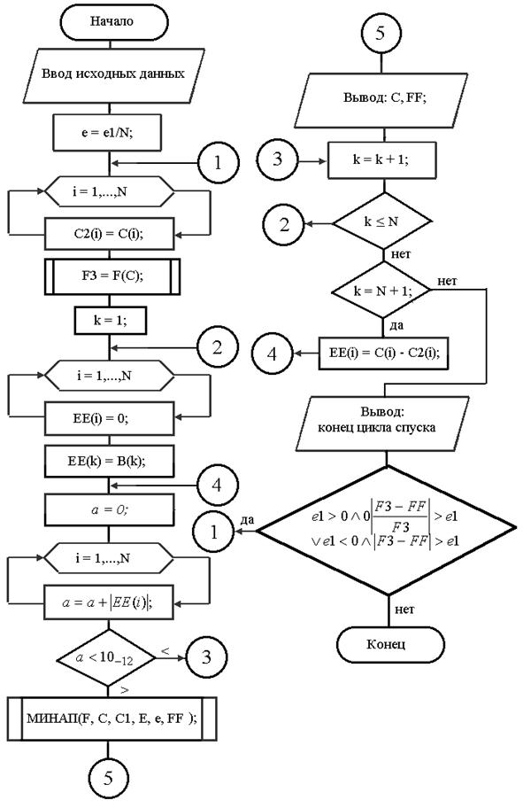 где формальные параметры подпрограммы обозначают: F, C, C1, EE – то же, что и в подпрограмме ДИАГ; e - точность вычисления минимума целевой функции (входная вещественная переменная): при е > 0 – относительная точность вычисления целевой функции; при е < 0 – абсолютная точность вычисления целевой функции; FF - значение минимума целевой функции (выходная вещественная переменная).