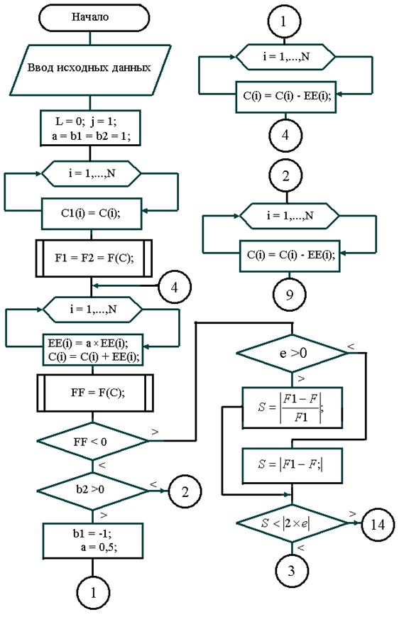 где формальные параметры подпрограммы обозначают: F – функция-подпрограмма, определяющая целевую функцию; С(N) – вектор начальных значений переменных (входной вещественный массив); В(N) – вектор начальных приращений переменных (входной вещественный массив); С1(N), C2(N), EE(N) – рабочие массивы (входные вещественные массивы); N – число переменных (целое); e1 – точность вычисления минимума целевой функции (входная вещественная переменная): при е1 > 0 – относительная точность вычисления целевой функции; при е1 < 0 – абсолютная точность вычисления целевой функции. После работы подпрограммы вектор С(N) содержит значения переменных, соответствующих минимальному значению целевой функции.
