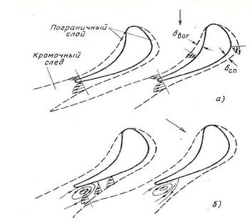 Потери на трение в пограничном слое можно определить теоретически, если известен режим пограничного слоя и его условные толщины у выхода из решётки. Обычно для сопловых конфузорных решёток минимальный коэффициент трения составляет ζтр =0.01 – 0.015; для рабочих решёток – ζтр =0.02 – 0.04. ζтр сильно зависит от шероховатости поверхности профиля и от числа Рейнольдса. Вторую часть профильных потерь составляют кромочные потери ζкр, которые образуются в результате отрыва потока за выходной кромкой (рис. 7).