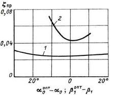 где ζ кр0 =0.01 – коэффициент кромочных потерь при нулевой толщине кромочных потерь. Минимальные профильные потери (ζпр) для сопловой решётки соответствуют шагу Следует обратить внимание на то, что при уменьшении шага Профильные потери сильно зависят от поворота потока в решётке. Так для сопловой решётки с В связи с этим в решётках с α1э=8 -100 потери энергии заметно выше, чем при α1э = 13 – 180, а решётки с α1э<80 почти не применяются в турбинах. При α1э>300 трудно обеспечить конфузорность на всём протяжении канала, что также приводит к возрастанию ζтр. Опыты показали, что для каждой решётки (строго говоря для каждого режима M, Re, E 0) существует оптимальный угол входа β1опт, при котором профильные потери будут минимальны ζминпр. Обычно (при β1ск < 900) β1опт = β1ск + (3:– 6)0. При уменьшении угла входа β1<β1опт ухудшается обтекание входного участка на спинке профиля, где может появиться диффузорный участок. При β1>β1опт, наоборот, ухудшается обтекание вогнутой поверхности профиля. Увеличение профильных потерь ζпр по сравнению с ζминпр в зависимости от угла вход для двух типов решёток показано на рис. 9, где 1 – сопловая решётка С-90-15А; 2 – рабочая решётка Р-30-21А.
