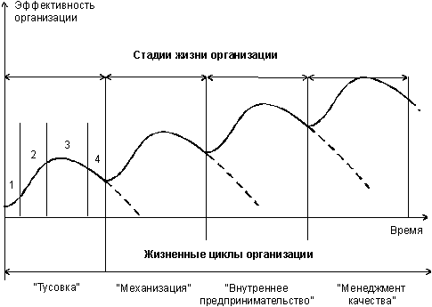 Рисунок10. Жизненные циклы организации Феномен ЖЦО представляет собой мощный инструмент, который обеспечивает понимание проблем, стоящих перед организациями, а также того, каким образом система управления организацией может перевести ее на каждую следующую стадию развития с минимальными потерями. Организационные консультанты проанализировали ряд длительно существующих фирм и обратили внимание на то, что организации проходят еще один временной цикл, более длительный по сравнению со стадийным, в котором можно выделить четыре различных типа ценностных установок. 1. Установка, характерная для цикла развития организации “ тусовка ”, ставит во главу ценности межличностного общения, создания внутрифирменной целостности на базе личных контактов, приверженности общим принципам коммуникации и подобным человеческим особенностям. 2. Установка, характерная для цикла развития организации под названием “ механизация ”, связана с пониманием ценности упорядочивания, определенности деятельности, внутренней организации. Именно на данном цикле развития организация впервые сталкивается с необходимостью замены сотрудников, которые хорошо вписываются в личностную, неформальную структуру, но не могут быть эффективными специалистами. 3. Установка, проявляющаяся в период цикла развития “ внутреннее предпринимательство ”, провозглашает необходимость максимального участия каждого из сотрудников в “предпринимательском процессе”. Такое представление о ценностях говорит о том, что любой сотрудник организации должен подходить к реализации своей деятельности как предприниматель, который представляет товар на рынке. А поэтому любой сотрудник должен хорошо знать своего клиента (и внутрифирменного также), его потребности и работать так, чтобы его продукт находил сбыт. 4. Установка, характерная для этапа “ управление качеством ”, связана с всемерной ориентацией всех и каждого на качество. В рамках данного цикла каждый сотрудник организации должен озаботиться проблемой качества (соответствия представлениям заказчика о желаемом) итогового продукта, а для этого каждый из промежуточных продуктов (полуфабрикатов) должен быть максимально качественным. Взгляд на организацию сквозь призму циклов развития позволяет более точно идентифицировать ее основные ценностные установки и ориентации, конкретизировать задачи, стоящие перед организацией, а также особенности управленческих подходов и кадрового обеспечения. Б.З. Мильнер выделяет 7 стадий жизненного цикла организации[18]: Содержание этапов жизненного цикла представлено в таблице 9.