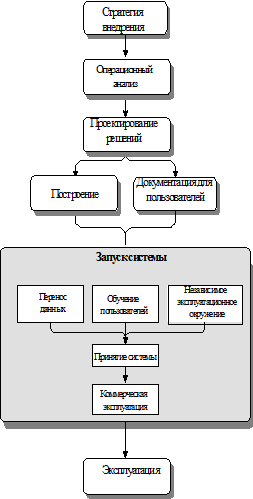 Переход к Новой Системе На этапе Перехода к Новой Системе проектная группа развертывает законченное решение внутри организации. Все стадии внедрения должны быть успешно закончены к моменту Перехода к эксплуатации. Проектная группа занимается подготовкой конечных пользователей в то время как технические консультанты настраивают рабочую среду и конвертируют данные. Переход к Новой Системе заканчивается в тот момент, когда пользователи начинают работать с новой системой. Данный этап предъявляет повышенные требования к объему выполняемой работы, поскольку пользователям необходимо работать как со старой, так и с новой системой одновременно. Управление происходящими изменениями и смягчение процесса перехода и связанных с ним негативных настроений должно быть приоритетным направлением на данном этапе. Предварительная подготовка и планирование облегчает процесс перехода к Новой Системе. В случае использования пофазного введения системы в эксплуатацию процесс Перехода может состоять из нескольких стадий, на каждой из которых части системы внедряются в разных по географии подразделениях или в разных департаментах одного подразделения.