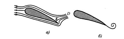 Скорости частиц вязкого воздуха возрастают по мере удаления от поверхности крыла. Благодаря этому в пограничном слое движение воздуха вихревое. Сверху крыла вращение совершается по, а снизу – против часовой стрелки, если поток воздуха набегает слева направо. Пусть в результате отрыва от поверхности крыла какая-то масса воздуха, находящаяся в пограничном слое снизу от крыла, уносится потоком в виде отдельных вихрей. Эта масса уносит определенный момент импульса. Если отрыва пограничного слоя воздуха от поверхности крыла под ним не происходит, то для сохранения полного момента импульса системы воздух во внешнем потоке должен начать циркулировать вокруг крыла по часовой стрелке. При этом скорость воздуха под крылом уменьшается, над крылом увеличивается и возникает подъемная сила, направленная вверх. Картина линий тока при несимметричном расположении крыла в потоке имеет вид, показанный на рис. 81а.