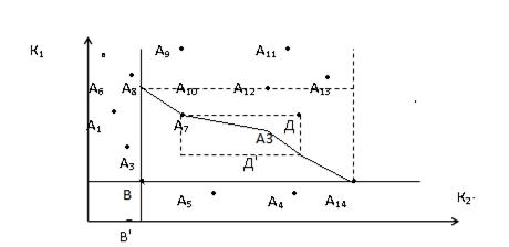 Чтобы выяснить, какие из строго допустимых точек А1,…,А16 являются нехудшими, применим метод прямоугольников. Он состоит из следующих этапов: 1-ый этап. Проводим вертикальную прямую ab через самую левую точку множества. Если на этой прямой оказалось более одной точки (например, точки А1 и А6), то из этих точек самая нижняя точка будет принадлежать Мнx (поскольку у неё самое маленькое значение коэффициента k2 и k1, меньше, чем у А6). 2-ой этап. Проводим горизонтальную прямую через самую нижнюю точку множества. Если на этой прямой оказалось более одной точки (например, точки А2, А15, и А6), то из этих точек самая левая (А2) принадлежит множеству Мнx (поскольку у неё самое маленькое значение коэффициента k1 и k1, меньшее, чем у А15 и А16. 3-ий этап. Через точки А1 и А2 проводим соответственно горизонтальную и вертикальную прямые до их пересечения (в точке Д). Тогда очевидно, что все остальные точки, принадлежащие множеству Мнx могут лежать лишь внутри прямоугольника А1 ДА2 В. 4-ый этап. Внутри прямоугольника А1ДА2В проводим вертикальную прямую через самую левую точку (точки) и горизонтальную прямую через самую нижнюю точку (точки), которые по аналогии с вышесказанным также будут принадлежать множеству Мнx (т.е. А3 и А4- принадлежат Мнx). 5-ый этап. Проведём через точку А3- горизонтальную прямую, а через точку А4- вертикальную прямую. Тогда все остальные точки множества Мнx расположены внутри прямоугольника А3ДА4В'. Далее процедура продолжается в том же порядке. В рассматриваемом примере (рисунок 2.10) в её продолжении нет необходимости, так как внутри прямоугольника А3Д'А4В' оказалась всего одна точка (А5), которая и является последней искомой точкой множества Мнx. Таким образом, в рассматриваемом случае искомое множество Мнx состоит из точек А1, А2, А3, А4, А5. 2. Число m учитываемых показателей качества сравнительно велико (например, m>5), а число N, сравниваемых вариантов, невелико (например, N≤5). Этот случай характерен для этапов проектирования, близких к заключительному. При этом множество Мнx можно искать методом, состоящим из следующих этапов: 1-ый этап. Присваиваем всем сравниваемым вариантам номера по следующему принципу: меньший номер - тому варианту, которому соответствует меньшее значение показателя k1. Если при этом окажется, что два или более варианта имеют одинаковое значение показателя k1, то меньший номер присваивается тому из них, которому соответствует меньшее значение показателя k2. Если окажется, что у некоторых вариантов одинаковы значения не только k1, но и k2, то меньший номер присваивается тому из них, которому соответствует меньшее значение показателя k3 и т.д. Наконец, если окажется, что два или более варианта имеют одинаковые значения всех m показателей качества (что крайне редко), то всем этим вариантам присваивается один и тот же номер, и они рассматриваются как единая система, точнее - класс систем. Сравнение вариантов внутри этого класса производится на последующих этапах проектирования, путём более точного определения, уже учтённых показателей качества или путём учёта дополнительных показателей качества. 2-ой этап. В соответствии с присвоенными номерами составляем для всех (строго допустимых) вариантов таблицу значений их показателей качества; например таблица 2.1 позволяет сравнить пять вариантов по шести показателям качества. Таблица 2.1