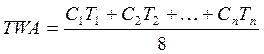 THRESHOLD LIMIT VALUE (TLV) refers to airborne concentrations of substances to which it is believed that nearly all workers may be repeatedly exposed day after day without adverse effect. There are three categories of exposure standards: - 8-hour time-weighted averages (TWAs); - Short-Term Exposure Limits (STELs); - Peak Limitations or Ceiling Values. 8-HOUR TIME-WEIGHTED AVERAGES (TWAs): average airborne concentration of a particular substance when calculated over a normal eight-hour working day, for a five-day working week. 8-Hour TWA exposures are calculated as follows: