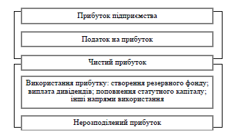 Отже, отриманий підприємством прибуток є об’єктом розподілу. У розподілі прибутку можна виділити два етапи [2] (рис. 1.10). Перший етап – це розподіл загального прибутку. На цьому етапі учасниками розподілу є держава й підприємство. У результаті розподілу кожний з учасників одержує свою частку прибутку.
