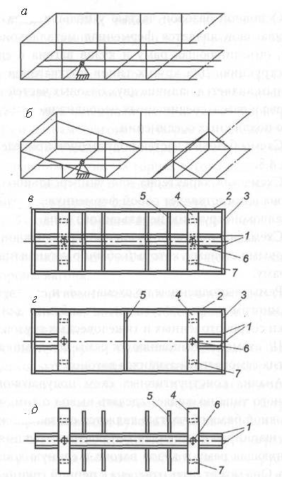 Наиболее распространенные типы полувагонов-хопперов имеют центральную или боковую двухстороннюю разгрузку. Хопперы могут собираться из двух и более стандартизируемых секций бункеров (схема ж). Люки бункеров открываются и закрываются с помощью пневмоцилиндров или вручную через зубчатую передачу. На схеме з представлен полувагон с наклоняющимся кузовом и открывающейся боковой стеной. Анализ конструктивных схем полувагонов различного типа позволяет сделать вывод о том, что их основной базовой частью является связанная жестко или шарнирно ферменная металлоконструкция, объединяющая раму и кузов вагона в единую цельнонесущую конструкцию. Схемы базовых частей полувагонов приведены на рис. 4.5.