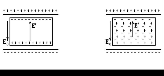 Лекция II. Электрическое поле в веществе. Уравнений Максвелла недостаточно, чтобы найти поля по данным распределениям зарядов и токов. Их необходимо дополнить так называемыми материальными уравнениями, которые характеризуют свойства среды. Для этого рассмотрим сначала электрическое поле в веществе. Поместим в электрическое поле плоского конденсатора металлическую пластинку (рис.35). Очевидно, свободные электроны соберутся на поверхности металла вблизи положительно заряженной пластины конденсатора. Поверхность проводника вблизи отрицательно заряженной пластины окажется положительной. Электроны будут двигаться до тех пор, пока результирующее поле Е не станет равным нулю Е + Е ¢ = 0,