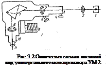 Наблюдение спектральных линий и измерение их положения производится на монохроматоре УМ-2 со стеклянной оптикой. Принципиальная схема УМ-2 приведена на рис 3.2. Схема состоит из трех основных частей: коллиматора 3-5, служащего для получения параллельного пучка лучей, диспергирующей системы 7 (призмы Аббе), разлагающей немонохроматический свет в спектр и зрительной трубы 8-11 для наблюдения спектра. Ход лучей в данной схеме следующий. Свет от источника I проходит через конденсор 2 и освещает щель 3, которая расположена в фокальной плоскости объектива коллиматора 5. Из объектива параллельный коллимированный пучок лучей направляется на диспергирующую систему 7. Если источник испускает немонохроматический свет, то вследствие того, что волны различных длин по разному преломляются в призмах из-за дисперсии показателя преломления, произойдет разложение света на монохроматические составляющие и из системы призм выйдут параллельные пучки лучей, соответствующие волнам определенных длин Монохроматор укреплен на рельсе, где также размещены источник света и конденсор, закрепленные на штативах. Входная щель регулируется по ширине микрометрическим винтом. В фокальной плоскости объектива 8 зрительной трубы имеется указатель в виде треугольника. Указатель наблюдается через окуляр. Вывод спектральной линии на указатель производится поворотом диспергирующих призм 7 при помощи барабана. Указатель освещается лампочкой. Окуляр 11 может устанавливаться по глазу наблюдателя на резкость изображения указателя и спектральных линий путем вращения. Отсчетным устройством прибора является барабан, который соединен с системой диспергирующих призм 7. На барабан нанесена винтовая дорожка с градусными делениями. Вдоль дорожки скользит указатель поворота барабана. При вращении барабана призма поворачивается и в центре поля зрения появляются различные участки спектра. При повороте барабана, на одно деление (2°) система призм поворачивается на 20". Сложная спектральная призма 7 состоит из 3 склеенных призм. Первые две призмы с преломляющими углами 30° изготовлены из тяжелого флинта, обладающего большой дисперсией. Промежуточная призма сделана из крона. Лучи отражаются от ее гипотенузной грани и поворачиваются на 90°. Благодаря такому устройству дисперсии призм складываются. УМ-2 относится к числу точных приборов. Он требует бережного и аккуратного обращения.