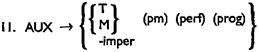 Here the auxiliary is AUX. It is made up of either -imper (imperative mood) or tense (T) or a modal (M), if (T) or (M) is selected; it can be followed by the other optional auxiliary elements: phrasal modal (pm) and the perfect (perf) and progressive (prog) aspects. (Imperative mood is a tenseless verb form in English.) You have already learned that morphological tense in English is either past or present. This choice is stated in phrase structure rule 12: