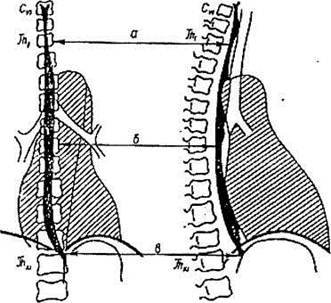 Рис. 48. Схема пищевода в прямой и боковой проекциях. Обозначения: а - шейная часть; б - грудная часть; в - брюшная часть.