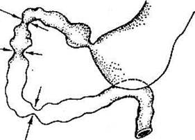 Рис. 53. Схематическое изображение сжимателей двенадцатиперстной кишки (обозначены стрелками).