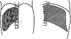 Рис. 12. Схематическое изображение печени. I - вертикальное положение; а - прямая передняя проекция; б - прямая боковая проекция; II - латеральное; в - на левом боку (прямая проекция); г - на спине (боковая проекция).