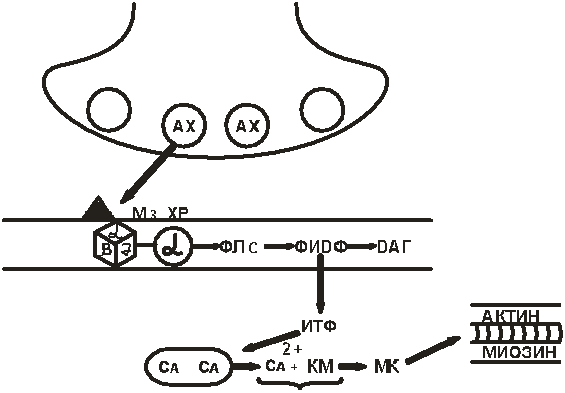 Рис. 9. М3-холинорецептор Са++ связывается с кальмодулином, активирует миозинкиназу (МК), катализирующую фосфорилирование легких цепей миозина, что приводит к сокращению клетки (рис. 9). Аналогичным образом передается импульс в синапсах секреторных желез. Норадреналин стимулирует α1-адренорецептор, запуская следующую цепь событий: Норадреналин (НА) → α1-адренорецептор → активирование α-субъединицы Gs-белка → активирование ФЛС → расщепление ФИДФ → увеличение концентрации ИТФ → увеличение концентрации Са2+ в клетке → Са2+связывается с кальмодулином → активируется миозинкиназа → фосфорилируются легкие цепи миозина → миозин взаимодействует с актином → развивается сокращение ГМК (рис. 10).