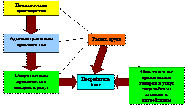 Отдельно от системы государства стоит рынок труда, где труд индивидуален и представляет собой обычное воспроизводство труда человека. Экономические отношения между трудящимися на рынке труда представляют собой простой обмен между людьми их результатами труда посредством денежного вознаграждения. Это невостребованный государством трудовой ресурс, который вовлекается в производства привлекательным вознаграждением. Римляне разведали, что в соседнем племени договоры не исполняются, все обманывают друг друга, все злые за это друг на друга. Князь с дружиной не пресекает это безобразие, народ на князя злится. Римляне собрались с силами, разбили дружину князя, объявили закон: «Договоры должны исполняться. За неисполнение своих обязательств перед контрагентом будет суровая ответственность.» Все перестали друг друга обманывать, все перестали друг на друга злиться. Прокуратор пресекает нечестивость – народ его любит, благами за это одаривает его (исправно налоги платит). Прокуратор с небольшим легионом спокойно почивает на лаврах и от жиру бесится. В следующее племя послали разведчиков… *** СИСТЕМА ГОСУДАРСТВА. Государство это племя или союз племён, как объединение людей, объединенных потребностью в обмене производимыми благами и совместной защите накопленных благ от других племён. Это объединение имеет строгую организацию, которая возникает из природы человека и природы отношений между людьми; это система экономических отношений между людьми в производствах и между производствами в экономических оборотах благ. Статика этой системы – производство, соединение четырёх факторов производства: ** труд населения страны; **национальный капитал, вложенный в средства производства и являющийся частными накоплениями предпринимателей в обороте, а также капитал административного, политического производства и армии, воспроизводимый от прибыли предпринимателей; ** земля – это территория страны; ** предпринимательская деятельность – организационно-управленческая деятельность административной системы. Динамика системы государства – это беспрерывная, целенаправленная, работа подсистем: **Общественное производство товаров и услуг, которое производит товары и услуги для потребителя; **Административное производство, которое производит управление общественным производством товаров и услуг; **Политическое производство, которое производит отбор кадров в управление административным производством; **Общественное производство товаров и услуг запрещённых законом к потреблению.
