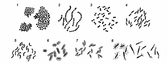 Рис. 1. Морфологические формы бактерий: 1 – стафилококки; 2 – стрептококки; 3 – диплококки; 4 – бациллы; 5 – спириллы; 6 – капсульные бациллы и кокки; 7 – жгутиковые бациллы