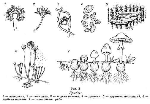 В пределах этого надцарства у растений выделяют царство грибов и царство растений. Царство Грибы — Mycota (Fungi). Для организмов этого царства, которое представляет собой очень гетерогенную группу организмов, характерны значительная выраженность клеточной оболочки, неподвижность в вегетативном состоянии, гетеротрофный тип питания путем всасывания (адсорбции) и неограниченный рост. Насчитывают около 100 000 видов грибов, характеризующихся разнообразием как по строению, размерам (рис. 3), местам обитания, так и по физиологическим функциям. Оптимальные температуры для роста грибов равны 20—26°С. Обитают практически во всех географических зонах, встречаясь в воде (пресной и морской) и почве, на мертвом органическом материале, многие виды паразитируют в тканях растений и животных, включая человека, причем степень паразитизма весьма различна. Грибы могут вступать в симбиотические отношения с другими организмами, например, с водорослями или цианобактериями, образуя лишайники. Они могут также вступать в симбиоз с высшими растениями, обволакивая и проникая в корни растений своими гифами и формируя структуры (корень + гриб), получивший название микориз. Такой симбиоз с растениями обеспечивает потребность последних в фосфатах. Например, 80% наземных растений, включая и многие сельскохозяйственные растения, формируют симбиоз с грибом Glornus versiforme, который обитает на их корнях и облегчает им восприятие фосфатов и минеральных питательных веществ из почвы. Среди организмов этого царства встречаются как одноклеточные (микроскопические), или низшие, так и многоклеточные (высшие) грибы. Грибы классифицируют на отделы: Настоящие грибы, Оомице-ты и Лишайники. Среди Настоящих грибов различают классы Хитридиевые грибы, Зигомицеты, Аскомицеты (Сумчатые грибы), Базидиомицеты и Несовершенные грибы (Дейтеромицеты).