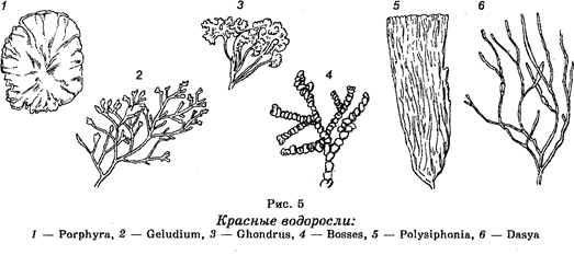 Ископаемые остатки лишайников также найдены в девоне, что определяет их возраст примерно в 400 млн лет. Предполагают, что образование лишайников явилось первым случаем установления симбиотических отношений между организмами. Это обеспечило возможность их широкого распространения в разных экологических нишах. Царство Растения (Plantae или Vegetabilia). Это царство представлено организмами, клетки которых обладают плотными клеточными стенками и которые способны к фотосинтезу. Растения этого царства классифицируют на три подцарства, а именно: багрянки (Phycobionta), настоящие водоросли (Phycobionta) и высшие растения (Embryophyta). Тело багрянок и настоящих водорослей не расчленено на ткани и органы. По этой причине их часто называют низшими, или слоевцовыми растениями. Напротив, остальные растения известны в качестве высших растений, т. к. характеризуются наличием разных тканей и расчленением тела на органы. Эти растения приспособлены к жизни в наземных условиях. Подцарство Багрянки (Rhodophyta). Растения этого подцарства являются многоклеточными организмами (рис. 5). Тело багрянок представлено слоевищем. Насчитывают около 4000 видов багрянок, среди которых наиболее известными являются порфира, не-малион, кораллины и другие. Их багряная окраска зависит от содержания в них хлорофилла, каротиноидов, красных фикоэритри-нов, синих фикоцианинов и других пигментов. Являются обитателями больших глубин морей и океанов. Часто их называют красными водорослями. Особенно ими богато Красное море. Размножаются как бесполым, так и половым путем с чередованием полового и бесполого поколений. Имеют хозяйственное значение. Отдельные виды служат сырьем, из которого добывают агар-агар. В ряде стран их используют на корм скоту Багрянки являются древними организмами, но происхождение их и филогенетические связи между отдельными видами остаются невыясненными. Подцарство Настоящие водоросли (Phycobionta). Настоящие водоросли являются растениями, тело которых представлено слоевищем. Известно около 30 000 видов этих организмов. Встречаются как одноклеточные, так и многоклеточные водоросли. Они являются обитателями в основном пресноводных водоемов и морей, но встречаются почвенные водоросли и даже водоросли снега и льда. Размножение одноклеточных водорослей происходит путем деления, многоклеточные формы размножаются как бесполым, так и половым путем. Когда-то Вергилий писал — «nigilvilor algo» (ничего нет хуже водорослей). В наше время водоросли приобрели Другие оценки.