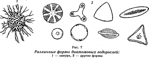 Хозяйственное значение этих водорослей невелико, если не считать, что из-за богатого содержания белков и витаминов хлореллу используют в корм для животных. Будучи компонентом фитопланктона, служит кормом для рыб. Предполагают, что зеленые водоросли возникли в результате ароморфозов, которыми оказались образование ядра, появление мно-гоклеточности и полового процесса. Предполагают также, что они дали начало примитивным наземным растениям, ставшими пред-ковыми формами мохообразных. Отдел Диатомовые водоросли, или диатомеи (Chrysophyta) представлен в основном многоклеточными организмами, а иногда даже и колониальными формами (рис. 7). Встречаются и одноклеточные формы. Известно 5700 видов. Характеризуются четкой дифференциацией тела на цитоплазму и ядро. Клеточная стенка «пропитана» кремнеземом, в результате чего ее называют панцирем. Являются обитателями пресных водоемов, морей и океанов и входят в состав фитопланктона.