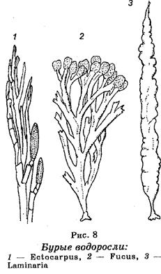 В клетках этих водорослей имеются хлоропласты в виде зерен или пластинок, которые окрашены в разные цвета из-за содержания разных пигментов (каротин, ксантофилл и его вариант диато-мин). По этой причине диатомовые водоросли часто называют золотисто-коричневыми. Размножение происходит путем деления клеток пополам. У отдельных видов существует половое размножение. Диатомеи — это диплоидные организмы. Напластования отмерших диатомовых водорослей дали начало диатомиту, который на 50-80% состоит из их панцирей и который используют в качестве поглотителей в химии и пищевой промышленности. Значение диатомовых водорослей в природе очень большое. Они занимают исключительно важное место в круговороте веществ, являясь главным кормом для рыб. Их пищевая ценность является очень высокой. Эволюционно диатомовые водоросли стоят ближе всего к зеленым водорослям, но происхождение их неясно. Отдел Бурые водоросли (Phaeophyta). Эти водоросли являются многоклеточными организмами. Каждая клетка содержит лишь одно ядро. По размерам они самые большие (длинные) водоросли, достигая в длину нескольких десятков метров (рис. 8). Известно около 900 видов. Являются обитателями морей и океанов, включая северные. Их пигментация определяется тем, что они содержат хлоропласты, окрашенные в бурый цвет из-за содержания хлорофилла, а также бурых пигментов (каротина, ксантофилла и фукок-сантина). Наиболее известными являются водоросли из родов Laminaria и Fucus.