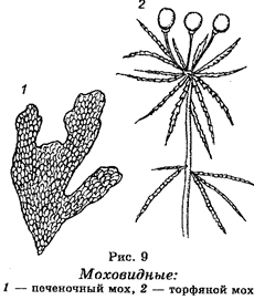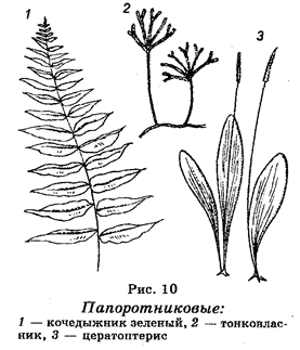 Значение моховидных в природе заключается в том, что, находясь в экосистемах, они воздействуют на среду обитания многих видов других растений, равно как и животных. Интенсивное размножение мхов способствует ухудшению почвы. Отмирая, сфагновые мхи «оторфовываются» и образуют залежи торфа. Некоторые виды используются в медицинской промышленности. Полагают, что растения этой группы были одними из первых наземных растений и широко произрастали еще 450-500 млн лет назад и что эволюция их заключалась в регрессивном развитии спорофита. Считают, что моховидные являются слепой эволюционной ветвью. Отдел Папоротниковидные (Palypodiophyta). В пределах этого отдела классифицируют травянистые растения, также обитающие в сырых местах (рис. 10). Некоторые Папоротниковидные, обитающие в тропиках, представлены древесными формами, отдельные из которых достигают 25 метров в высоту. Насчитывают более 10 000 видов этих растений. Типичными представителями папоротниковидных являются папоротники. Для папоротниковидных также характерно чередование полового и бесполого поколений, однако, в отличие от моховидных, у организмов, принадлежащих к этому отделу, преобладающим является спорофит, для которого характерна диплоидность. У спорофита имеются основные органы — стебель, листья, корень. Напротив, гаметофит характеризуется очень малыми размерами, представляя небольшую пластинку, прикрепленную к почве с помощью ризоидов. Для папоротниковидных характерен сложный цикл развития. Цикл начинается с развития изоспор гаметофита (заростка), на котором образуются половые органы в виде антеридиев и архегониев. В последних развиваются половые клетки. После их оплодотворения из зиготы образуется спорофит, на котором образуются споры, дающие начало гаметофиту. Большинство папоротниковидных представлено разноспоровыми растениями. Значение папоротниковидных в природе большое, т. к. они входят в состав многих экосистем. Хозяйственное значение современных папоротниковидных небольшое, если не считать, что растения отдельных видов служат лекарственным сырьем. Папоротниковидные классифицируют на 7 отделов, большинство из которых представлено вымершими видами. Папоротниковидные являются наиболее древними споровыми растениями. Они уже были в девоне, а в карбоне составляли леса из растений, высота которых достигала до 30 м. Остатки этих растений принимали участие в образовании каменного угля. Отдел Голосеменные (Gymnospermae). Растения этого отдела дают семена, которые представляют собой, по существу, готовые зародыши будущих растений. Основными органами семени являются зародышевый корешок, зародышевый стебелек, зародышевые листки. Однако у голосеменных семя не покрыто плодолистиками. По этой причине их называют голосеменными. Голосеменные представлены деревьями, кустарниками и лианами. Количество видов составляет около 700. Распространены по всему земному шару. В северном полушарии занимают огромные площади, образуя хвойные леса. Наиболее известными представителями голосеменных являются сосна, пихта, ель, лиственница. У растения этого отдела тканями ствола и корня являются камбий, ксилема, флоэма. У многих листья представлены «иголками». Для голосеменных характерно чередование поколений, связанное со сменой гаплоидного и диплоидного состояний, однако у них нал