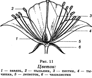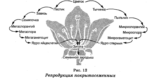 Хозяйственное значение голосеменных очень большое. Они дают древесину, сырье для медицинской промышленности. Многие виды являются декоративными. Голосеменные представляют собой очень древнюю группу высших растений. Появившись в девоне (около 350 млн лет назад), голосеменные в конце палеозоя — начале мезозоя заняли место папо-ротниковидных, поскольку оказались более приспособленными к жизни в наземных условиях. Одна их гипотез заключается в том, что голосеменные произошли от древнейших папоротниковидных. Отдел Покрытосеменные, или Цветковые (Angiospermae, или Magnoliophyta). Растения этого отдела встречаются почти повсеместно. На их долю приходится 250 000-300 000 видов, т. е. почти две трети видов царства растений. В настоящее время они являются самой процветающей группой растений. В пределах этого отдела различают однодольные и двудольные растения, которые бывают как травянистыми и кустарниковыми видами, так и деревьями. Типичными представителями этого отдела являются рожь, пшеница, роза, береза, осина и другие. Различают однодольные и двудольные покрытосеменные растения. Для этих растений также характерно чередование поколений, но у них произошло значительное уменьшение гаметофита. Замечательной особенностью этих растений является наличие у них цветка, который представляет собой видоизмененный побег и является производным спорофита (рис. 11). Именно по этой причине растения, образующие цветки, называют цветковыми. Как правило, цветки обоеполы, но иногда и раздельнополы. В цветке различают пестик и тычинки, которые являются его главными частями. В нижней части пестика (завязи) развиваются семена. По этой причине эти растения получили название покрытосеменных. Нижняя часть пестика представлена завязью, узким столбиком и рыльцем. Что касается тычинок, то каждая из них состоит из тычиночной нити и пыльника. У обоеполых растений, которые среди покрытосеменных составляют большинство, цветки имеют как пестики, так и тычинки, т. е. эти растения имеют пестичные (женские) и тычиночные (мужские) цветки. Но у многих видов одни цветки имеют только пестики, на другом — только тычинки. Такие растения называют двудомными. Опыление является результатом переноса пыльцы с тычинок на рыльце пестика. Общая схема репродукции покрытосеменных на рис. 12.