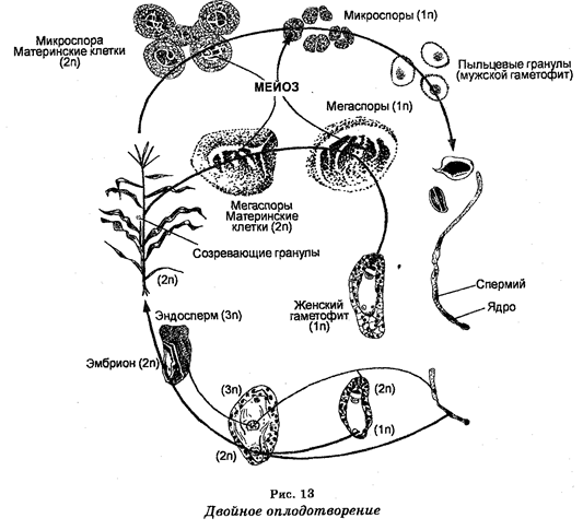 Женский гаметофит цветковых растений состоит из 8 клеток зародышевого мешка, одна из которых является яйцеклеткой. Эта микроскопическая структура развивается из одиночной мегаспоры. Мужской гаметофит развивается из микроспоры, или пыльцевой гранулы, располагающейся в микроспорангии пыльника. Попав на рыльце пестика, пыльцевая гранула в результате деления дает начало генеративной клетке и клетке, развивающейся в пыльцевую трубку. Далее пыльцевая трубка врастает в полость завязи. Ядро трубки генеративной клетки мигрирует к низу пыльцевой трубки, где генеративная клетка делится, давая два спермин. Один из этих спермиев сливается с яйцеклеткой, образуя диплоидную зиготу, тогда как второй спермий сливается с ядром (в центре зародышевого мешка, в семязачатке), давая триплоидное ядро, развивающееся затем в эндосперм. В конечном итоге обе структуры оказываются в семени, а семя оказывается в завязи, которая развивается в плод. Последний может содержать от одного до нескольких семян. Такое оплодотворение называют двойным (рис. 13). Оно было открыто в 1898 г. С. Г. Навашиным (1857—1950). Биологический смысл двойного оплодотворения заключается в том, что развитие триплоидного эндосперма в сочетании с огромным числом поколений обеспечивает экономию пластических и энергетических ресурсов растений.