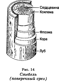 Листья являются важнейшим органом растений. Они характеризуются разной формой и построены из нескольких слоев клеток, содержащих большое количество хлоропластов. Служат органом газообмена между растениями и средой. Из-за наличия хлорофилла в листьях происходит фотосинтез, основу которого составляют две реакции — фотолиз воды и фиксация COg. Корень является органом растения, который адсорбирует воду и минеральные вещества из почвы и проводит их к стеблю. У покрытосеменных, как и голосеменных, вода и питательные вещества из почвы адсорбируются корневыми волосками и проводятся в ксилему в результате осмотического давления в корневой системе, действия капилляров, отрицательного давления в ксилеме, доходящего иногда у некоторых древесных форм до 100 бар, и транспирации, т. е. испарения воды из листьев (рис. 15). Хозяйственное значение покрытосеменных переоценить очень трудно, т. к. они исключительно широко используются в жизни человека (источник продовольствия, сырье для промышленности, корм для животных и т. д.). Покрытосеменные растения являются господствующими растениями нашей планеты. Поэтому объяснение их происхождения уже давно оказалось одной из самых важных задач в учении об эволюции. Начиная с Ч. Дарвина, для объяснения покрытосеменных растений было выдвинуто несколько гипотез. По одной из них предполагают, что покрытосеменные произошли от каких-то голосеменных, а однодольные происходят от каких-то древних двудольных. Однако эта и другие гипотезы не являются исчерпывающими. Существуют разногласия и в определении времени появления покрытосеменных. По новейшим представлениям главная диверсификация цветковых растений, в том числе разделение на однодольные и двудольные, произошла 130—90 млн лет назад, и это дало тогда начало изменениям земных экосистем.