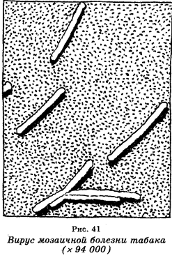 Впервые ВИЧ был выделен в 1959 г. в Заире, после чего второй случай выделения этого вируса (в США) датируется 1969 г. С тех пор был выделен ряд штаммов ВИЧ. Открытие ВИЧ позволило по-новому взглянуть на мир вирусов, с одной стороны, и на характер общения между людьми, с другой стороны. Вирусы, растений также широко распространены в природе, вызывая болезни растений разной видовой принадлежности. Как уже отмечено, первым открытым вирусом оказался МБТ-вирус мозаичной болезни табака (рис. 41), повреждающий листья растений этого вида. Помимо вируса мозаичной болезни табака широко известны вирусы некроза табака, желтой карликовости картофеля, желтой мозаики репы, а также вирусы, поражающие многие другие культурные и дикие растения. Форма вирусов растений в основном бывает палочковидной и округлой. Размеры вирусов палочковидной формы составляют 300-480 х 15 нм, а размеры тех, которые имеют округлую форму, равны 25-30 нм.