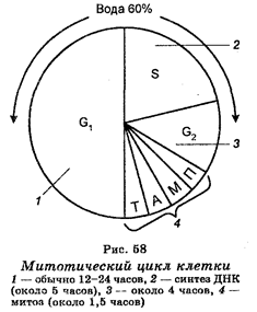 Размножение или пролиферация (от лат. proles — потомство, ferre — нести) клеток — это процесс, который приводит к росту и обновлению клеток. Данный процесс характерен как для одноклеточных, так и многоклеточных организмов. Клетки-организмы (одноклеточные организмы) размножаются простым делением надвое (бактерии, саркодовые), множественным делением (споровики и др.) или другим путем. Поэтому у бактерий и одноклеточных животных удвоение клеток представляет собой размножение их как самостоятельных организмов, поскольку из исходной формы (организма) образуется две новые клетки, каждая из которых является организмом. Каждая дочерняя клетка (организм) получает полную генетическую информацию, несомую исходной клеткой-организмом. Соматические клетки многоклеточных организмов размножаются путем сложного деления, которое получило название митоти-ческого деления и которое в общем виде представляет собой механизм, посредством которого одиночные клетки репродуцируют себя. Образовавшиеся в результате деления дочерние клетки подобны исходной (материнской) клетке, отличаясь от последней лишь меньшими размерами. Однако вслед за делением дочерние клетки мгновенно начинают расти и быстро достигают размеров материнской клетки. Биологический смысл митотического деления состоит в том, что оно является ключевым событием в точной репликации всех хромосом еще до того, как произойдет деление ядра и клетки. В результате митоза дочерние клетки после деления получают хромосомы в точно таком же количестве, какое имела их родительская (материнская) клетка. Следовательно, митотическое деление есть особый способ упорядоченного деления клеток, при котором каждая из двух дочерних клеток получает хромосомы в точно таком же количестве и точно такого же строения, что и хромосомы, которые имела материнская клетка. При каждом митозе образуется копия каждой хромосомы и действует точный механизм их распределения между дочерними клетками. В митотическом делении клетки различают две стороны — разделение исходного ядра на два дочерних ядра (равное деление хромосом), называемое кариокинезом (от греч. caryon — ядро, kinesis — движение) и представляющее собой, по существу, хромосомный цикл, и следующее затем разделение цитоплазмы с образованием двух дочерних клеток, называемое цитокинезом (от греч. cytos — клетка, kinesis — движение) и представляющее собой цитоплазматический цикл. Каждая из дочерних клеток содержит одно дочернее ядро. Кариокинез и цитокинез протекают синхронно, причем в кариоки-незе имеет место чередование синтеза ДНК с митозом, тогда как цитокинез чередуется с ростом клеток (удвоением в числе клеточных компонентов). Существенной особенностью митотического деления является то, что оно в значительной мере сходно у всех организмов. Совокупность процессов, происходящих в клетке от одного деления до другого, получило название митотического цикла. Митотический цикл состоит из двух стадий — стадии покоя или интерфазы и стадии деления или митоза (от греч. rnitos — нить), обозначаемого символом м. Термины «митоз» и «кариокинез» — синонимы. Интерфаза доступна для оценки качественно и количественно, точно так же доступен для измерения и митоз. В частности, для измерения интенсивности количества митозов используют так называемый митотический индекс, под к