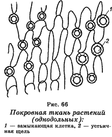 Покровные ткани представлены плотно сомкнутыми клетками, располагающимися на внешней поверхности растений (рис. 66). К этим тканям относят эпидерму листьев, а также пробковые слои стебля и корней. Они выполняют защитную функцию, предохраняя от высыхания или механических повреждений лежащие глубже тонкостенные клетки.