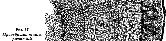 Основные ткани представлены различными по форме клетками, образующими основную массу тела растений (мягкие части листьев, цветков, плодов, сердцевину стеблей и корней, а также кору). Главная функция этих тканей заключается в синтезе и накоплении питательных веществ. В частности, часть этих тканей представлена хлоропластосодержащими клетками, в которых происходит фотосинтез. Проводящие ткани (рис. 67) представлены ксилемой (древесина) и флоэмой (луб). Клетки ксилемы дают начало длинным клеткам, называемым трахеидами. Соединяясь между собой концами, трахеиды образуют сосуды древесины. После растворения в них поперечных стенок они превращаются в длинные целлюлозные трубки, по которым и проходит вода. Ксилема проводит воду и растворенные в ней соли от корня к листьям, что представляет собой восходящий (транспирационный) ток. Флоэма образуется так же, как и ксилема, но с той лишь разницей, что поперечные стенки не устраняются, а сохраняются. Однако в них образуются отверстия, обеспечивающие «проход» органических веществ от листьев к корням. Следовательно, флоэма обеспечивает нисходящий ток, т. е. движение органических веществ от листьев к корням.