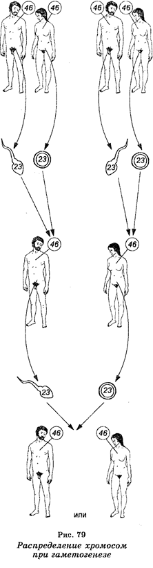 У млекопитающих мейоз осуществляется в специализированных клетках семенников и яичников, в которых продуцируются мужские и женские гаметы соответственно. Выявлены белки — индукторы мейоза. В процессе мейоза дипдоидное число хромосом (2п), которое характерно для соматических клеток (клеточных ядер) и незрелых зародышевых клеток, изменяется до гаплоидного числа (In), характерного для зрелых зародышевых клеток. Таким образом, в результате гаметогенеза половые клетки получают лишь половину хромосом соматических клеток (рис. 79). Поведение хромосом в период гаметогенеза у животных является одинаковым как у мужских, так и у женских особей. Однако пол различается во времени происхождения разных стадий мейоза, что особенно заметно у человека. У мужских особей в постпубертатный период полный процесс мейоза завершается примерно в течение двух месяцев, в то время как у женских особей первое мейотическое деление начинается еще в фетальном яичнике и не завершается, пока не начнется овуляция, которая наступает у них примерно в пятнадцать лет. У высших животных в случае мужских особей мейоз сопровождается образованием четырех функционально активных гамет (рис. 80). Напротив, у женских особей каждый овоцит II порядка дает лишь одну яйцеклетку. Другие ядерные продукты женского мейоза представляют собой три редукционных тельца, которые не участвуют в размножении и дегенерируют. Мейоз состоит из двух делений клеточного ядра, которые называют мейотическими. Первое мейотическое деление ядра разделяет членов каждой пары гомологичных хромосом после того, как они спарились одна с другой (синапсис) и обменялись генетическим материалом (кроссинговер). В результате этого разделения образуется два гаплоидных ядра. Второе мейотическое деление разделяет две продольные половины хромосом (хроматиды) в каждом из этих ядер, продуцируя четыре гаплоидных ядра. В процессе гаметогенеза происходит также дифференциация яйцеклеток (овогенез) и сперматозоидов (сперматогенез), являющаяся пререквизитом их функций. Будучи высокоспециализированными структурами, яйцеклетки животных намного крупнее сперматозоидов, обычно неподвижны и содержат питательный материал, который обеспечивает развитие эмбриона в начальном периоде после оплодотворения. Сперматозоиды большинства животных обладают жгутиком, обеспечивающим независимость их движения.