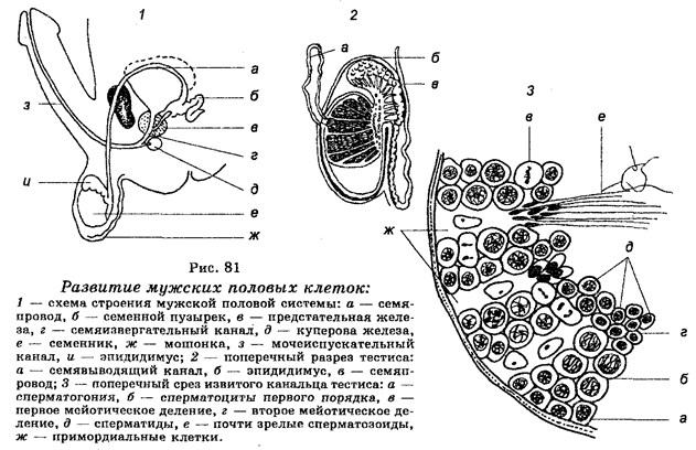 Мейоз имеет выдающееся биологическое значение. Благодаря мейозу в клетках организмов поддерживается постоянное число хромосом независимо от количества поколений. Следовательно, мейоз поддерживает постоянство видов. Наконец, в мейозе в результате кроссинговера происходит рекомбинация генов, которая является одним из факторов эволюции, хотя его значение является и меньшим по сравнению с мутагенезом. Сперматогенез — это процесс образования зрелых мужских половых клеток. Сперматозоиды развиваются в мужских половых железах (семенниках, или тестисах) из специализированных соматических клеток (рис. 81). Такими специализированными клетками служат так называемые примордиальные зародышевые клетки, которые мигрируют к тестисам в раннем периоде эмбриогенеза мужского индивидуума. Следовательно, примордиальные клетки являются прародителями (предшественниками) зрелых половых клеток. У млекопитающих после достижения половой зрелости сперматозоиды образуются практически всю жизнь. Семенники человека состоят из многочисленных канальцев, стенки которых сформированы слоями клеток, которые находятся на разных стадиях развития сперматозоидов. Наружный слой канальцев образован крупными клетками, называемыми сдерма-тогониями. Эти клетки содержат диплоидный набор хромосом и являются в тестисах потомками примордиальных зародышевых клеток.