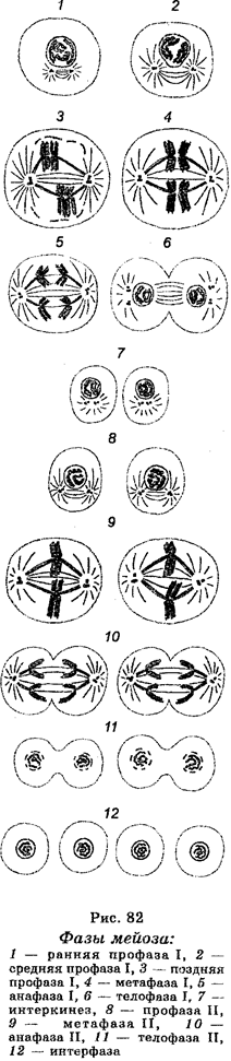 Первое мейотическое деление начинается в первичном сперматоците и характеризуется длинной профазой, которая состоит из переходящих одна в другую профазы I и профазы II. В профазе I различают пять главных стадий — лептонему, зигонему, пахинему, диплонему и диакинез. На стадии лептонемы хромосомы в ядре представлены в виде тонких спирализованных нитей, содержащих многочисленные темноок-рашенные гранулы (хромомеры). Расщепления хромомер и нитей не отмечают, но считают, что хромосомы на уровне этой стадии являются двойными, т. е. диплоидными. Гомологи каждой хромосомной пары объединяются хромомерами вдоль их длины по принципу застежки. На стадии зигонемы характерно установление синапсов между гомологичными хромосомами, в результате чего образуются спаренные хромосомы (биваленты). Хромосомы Х и Y ведут себя по сравнению с аутосомами несколько по-другому. Они конденсируются в темноокрашиваемые гетерохроматиновые тела, спариваемые в результате наличия гомологичных районов на их концах. На стадии пахинемы, которая является наиболее долгой во времени стадией в мейотической профазе, происходит конденсация бивалентов и разделение каждой хроматиды надвое, в результате чего каждый бивалент представляет собой сложную спиральную структуру, состоящую из четырех сестринских хроматид (тетрад). В конце этой стадии начинается разделение спаренных хромосом-бивалентов. Теперь гомологичные хромосомы могут наблюдаться рядом. Поэтому в некоторых препаратах можно видеть четыре хромосомы, которые образуются в результате дупликации каждого гомолога, формирующего сестринские хроматиды. На этой стадии происходят обмены между гомологами и формирование хиазм. На стадии диплонемы происходит укорачивание, утолщение и взаимное отталкивание сестринских хроматид, в результате чего хроматиды в биваленте почти разъединены. Разделение является неполным по той причине, что в каждой паре хромосом еще не расщеплена центромера. Что касается бивалентов, то они удерживаются на различных местах вдоль их длины с помощью хиазм, которые являются структурами, сформированными между гомологичными хроматидами в результате предыдущего кроссинговера между синаптически связанными гомологами. В хороших препаратах можно наблюдать от одной до нескольких хиазм в зависимости от длины бивалента. Каждая наблюдаемая на этой стадии хиазма представляет собой результат обмена, который встречался между несестринскими хроматидами в течение стадии пахинемы. Поскольку сжатие и отталкивание бивалентов усиливается, хиазмы двигаются к концам хромосом, т. е. происходит терминализа-ция хромосом. В конце диплонемы наступает деспирализация хромосом; гомологи продолжают отталкиваться друг от друга. На стадии диакинеза, которая сходна с диплотеной, продолжается укорочение бивалентов и наступает ослабление (уменьшение) хиазм, вследствие чего формируются дискретные единицы в виде хроматид (четырех). Непосредственно после завершения этой стадии происходит растворение ядерной мембраны. В метафазе I биваленты достигают наибольшей конденсации. Становясь овальными, они располагаются в экваториальной части ядра, где формируют экваториальные пластинки мейотической метафазы I. Форма каждого бивалента определяется числом и локализацией хиазм. У мужчин число хиазм на бивал