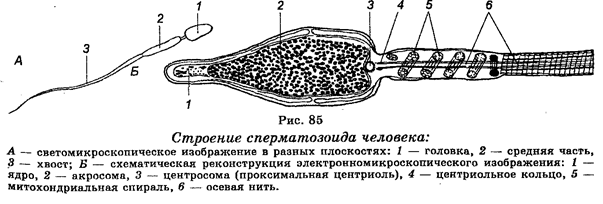 Мужские половые клетки, продуцируемые организмами разной видовой принадлежности, характеризуются подвижностью и чрезвычайным разнообразием в размерах и по структуре (рис. 84). Например, длина сперматозоидов D. melanogaster составляет 1,76 мм, что в 300 раз превышает длину сперматозоидов человека. Больше того, длина сперматозоидов D. bifurca составляет более 28 мм, что превышает длину самих насекомых этого вида в двадцать раз. Каждый сперматозоид человека состоит из трех отделов — головки, средней части и хвоста (рис. 85). В головке сперматозоида располагается ядро. В нем содержится гаплоидный набор хромосом. Головка снабжена акросомой, которая содержит литические ферменты, необходимые сперматозоиду для вступления в яйцеклетку. В головке локализуется также две центриоли — прокси-мальная, которая побуждает деление оплодотворенной сперматозоидом яйцеклетки, и дистальная, которая дает начало аксимальному стержню хвоста. В средней части сперматозоида располагаются ба-зальное тельце хвоста и митохондрии. Хвост (отросток) сперматозоида образован внутренним аксимальным стержнем и внешним футляром, имеющим цитоплазматическое происхождение. Сперматозоиды человека характеризуются значительной подвижностью.