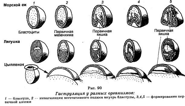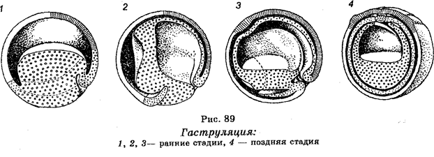 Развитие двух зародышевых листков характерно для губок и кишечнополостных. Однако для хордовых в период гаструляции характерно развитие третьего зародышевого листка — мезодермы (от греч. mesos — средний), образующегося между эктодермой и энтодермой (рис. 90). Гаструляция является необходимым пререквизитом для последующих стадий развития, поскольку она приводит клетки в положение, открывающее возможность формировать органы. Дифференцированный на три эмбриональных закладки зародышевый материал дает начало всем тканям и органам развивающегося зародыша.